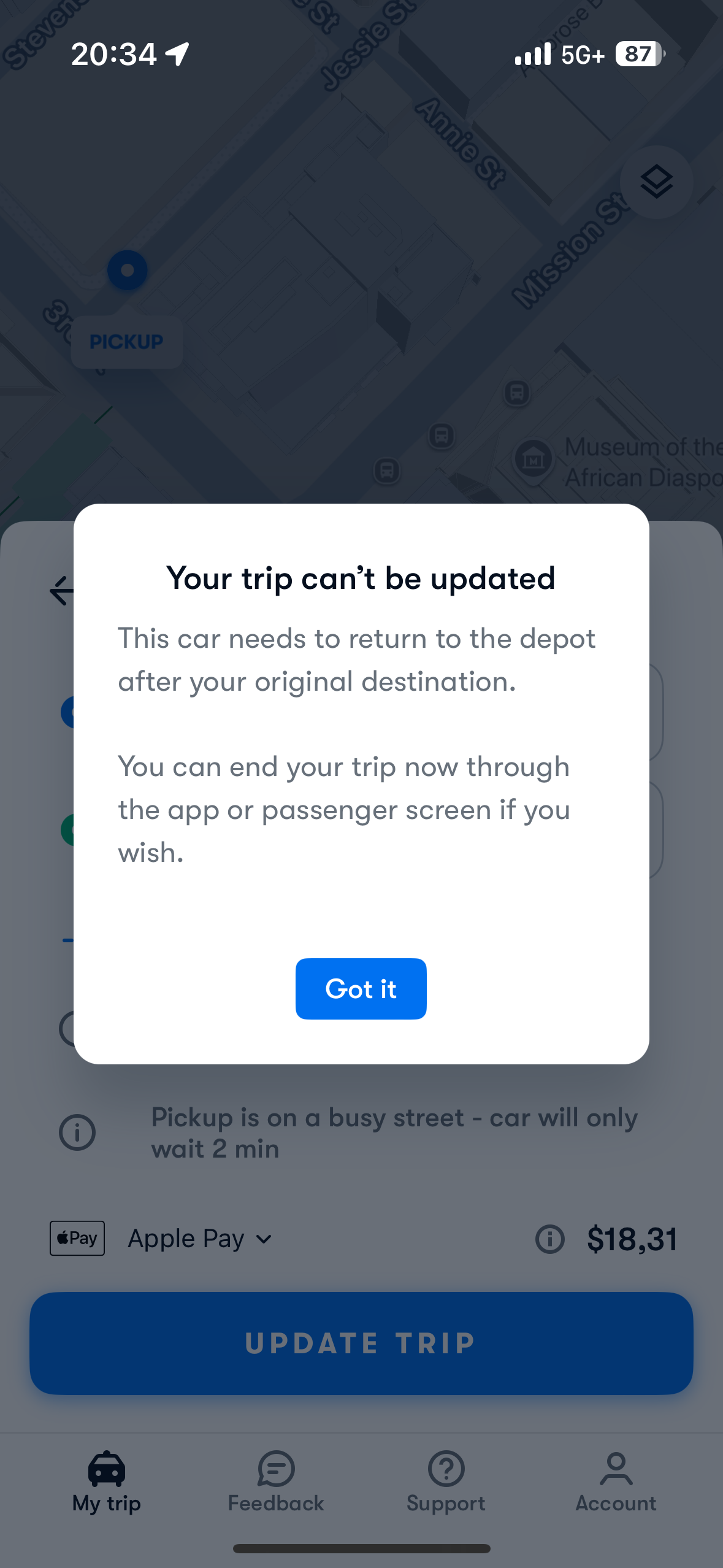 When confirming the change of destination, a message came up that was different and rejected the update. And the reason was not that I had made such destination changes too often, but that my Robotaxi had to go to the depot or had been called and would go there after arriving at its destination. And that was the message: