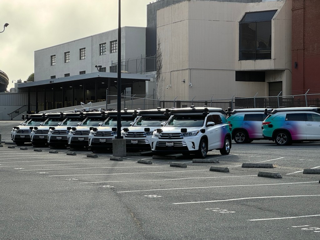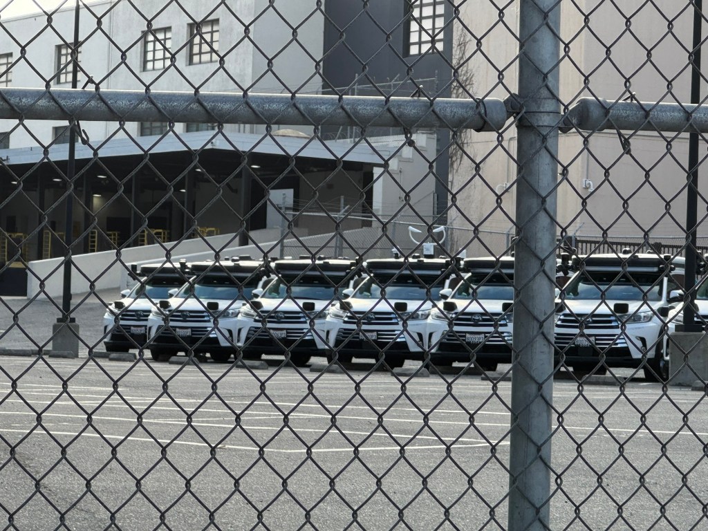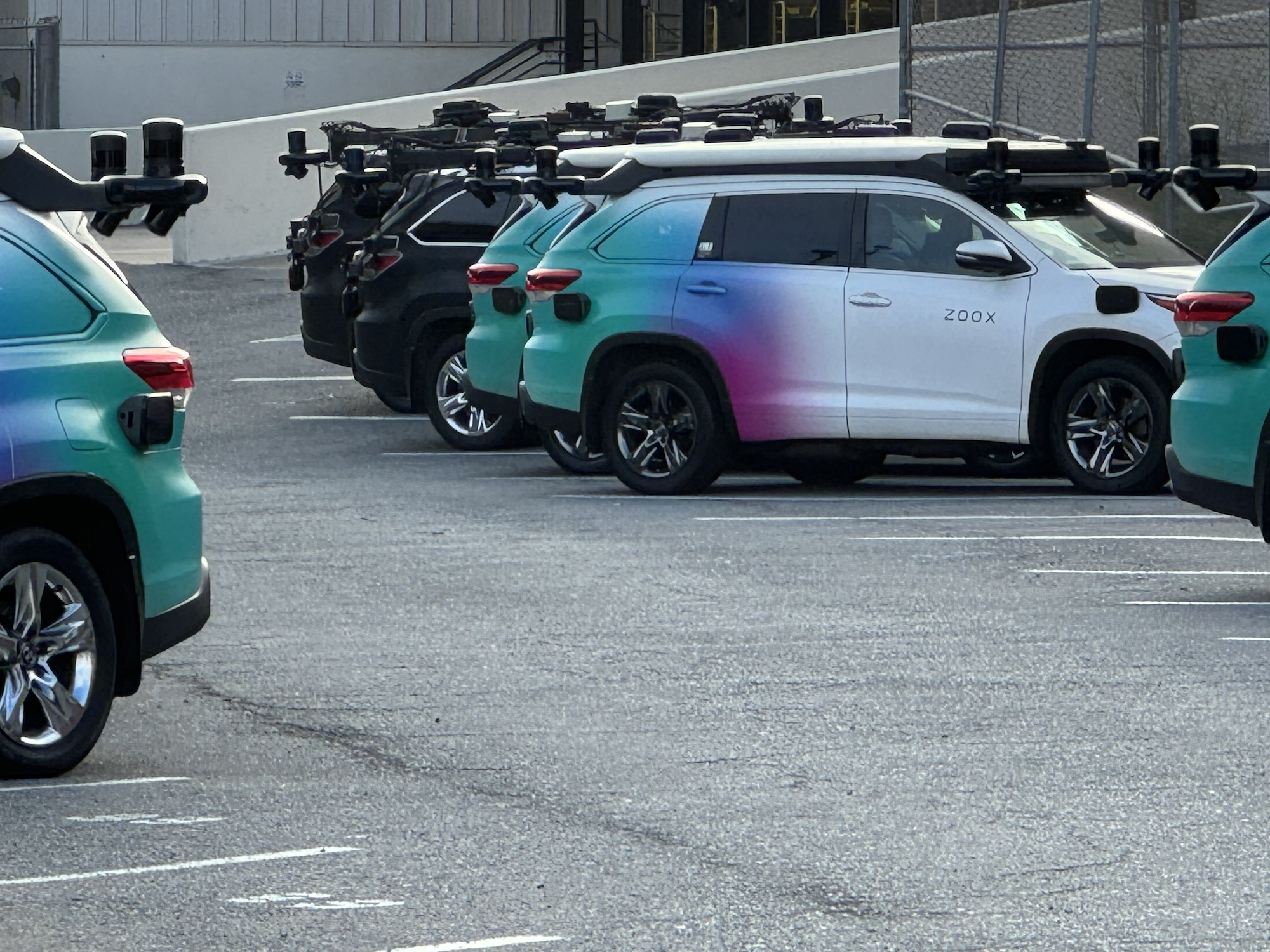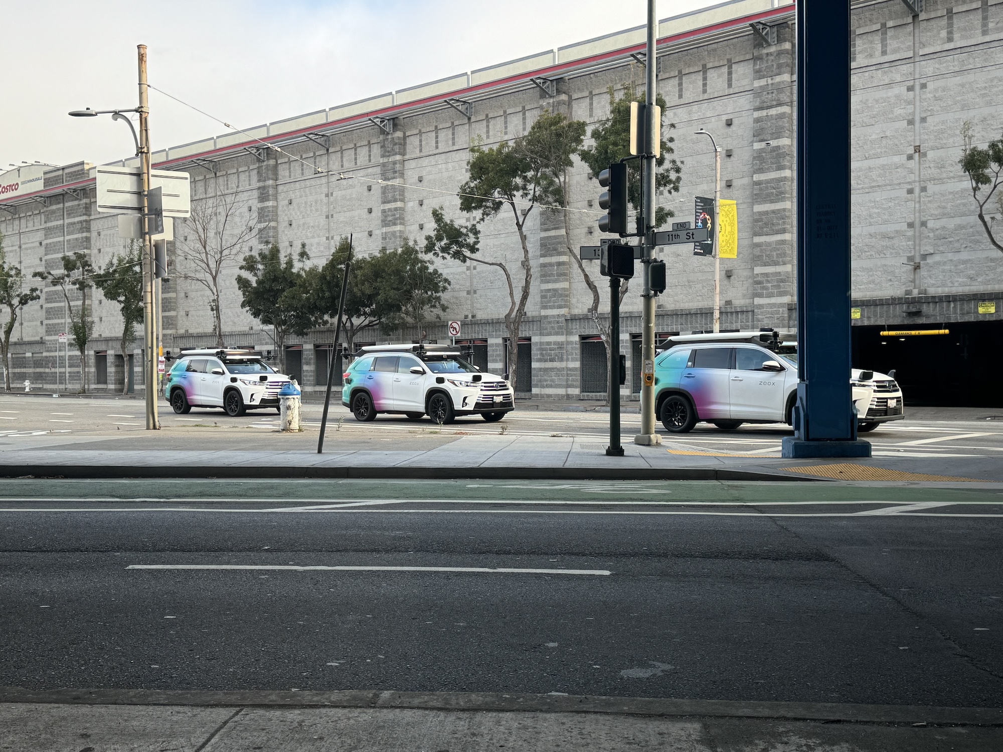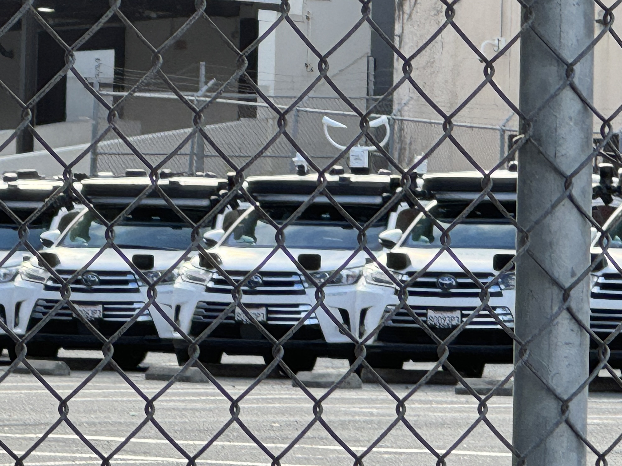 This is the outside Zoox depot on Bryant Street, corner Division Street in San Francisco. On Division Street is the inside depot. What can be seen are 13 latest generation test mules, and two of the old (black) ones. One Vehicle can be seen having those viking horns, like I have encountered a few months ago.