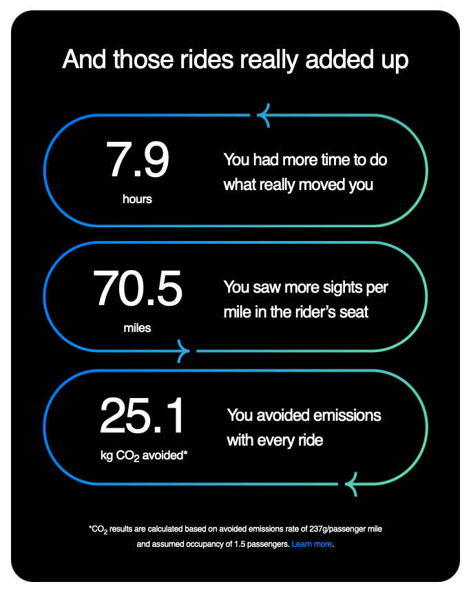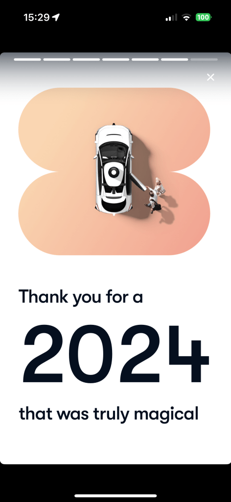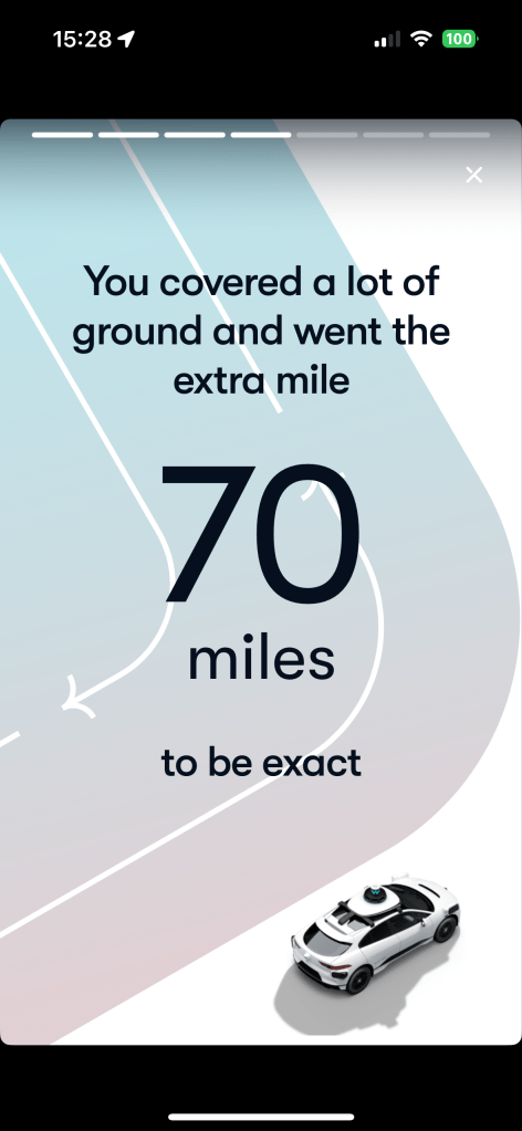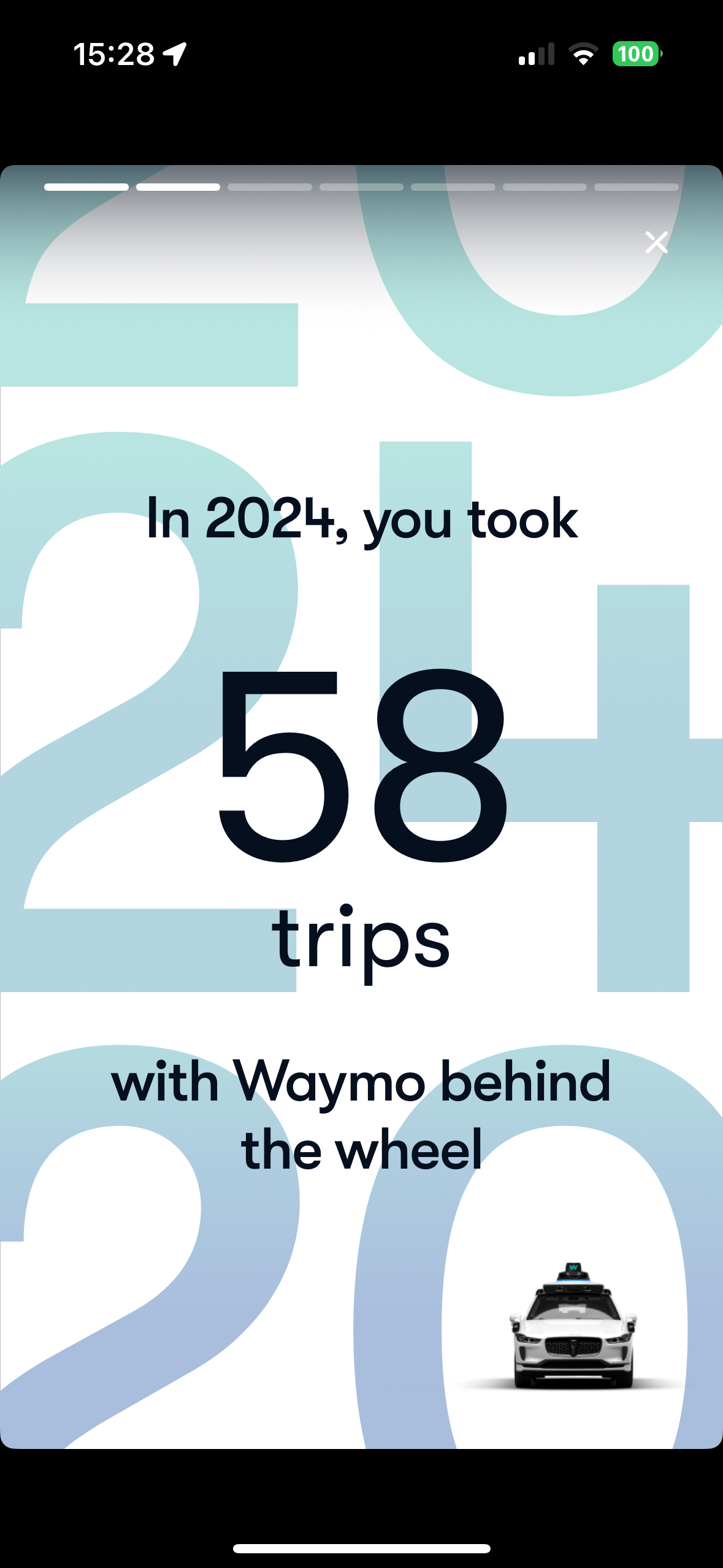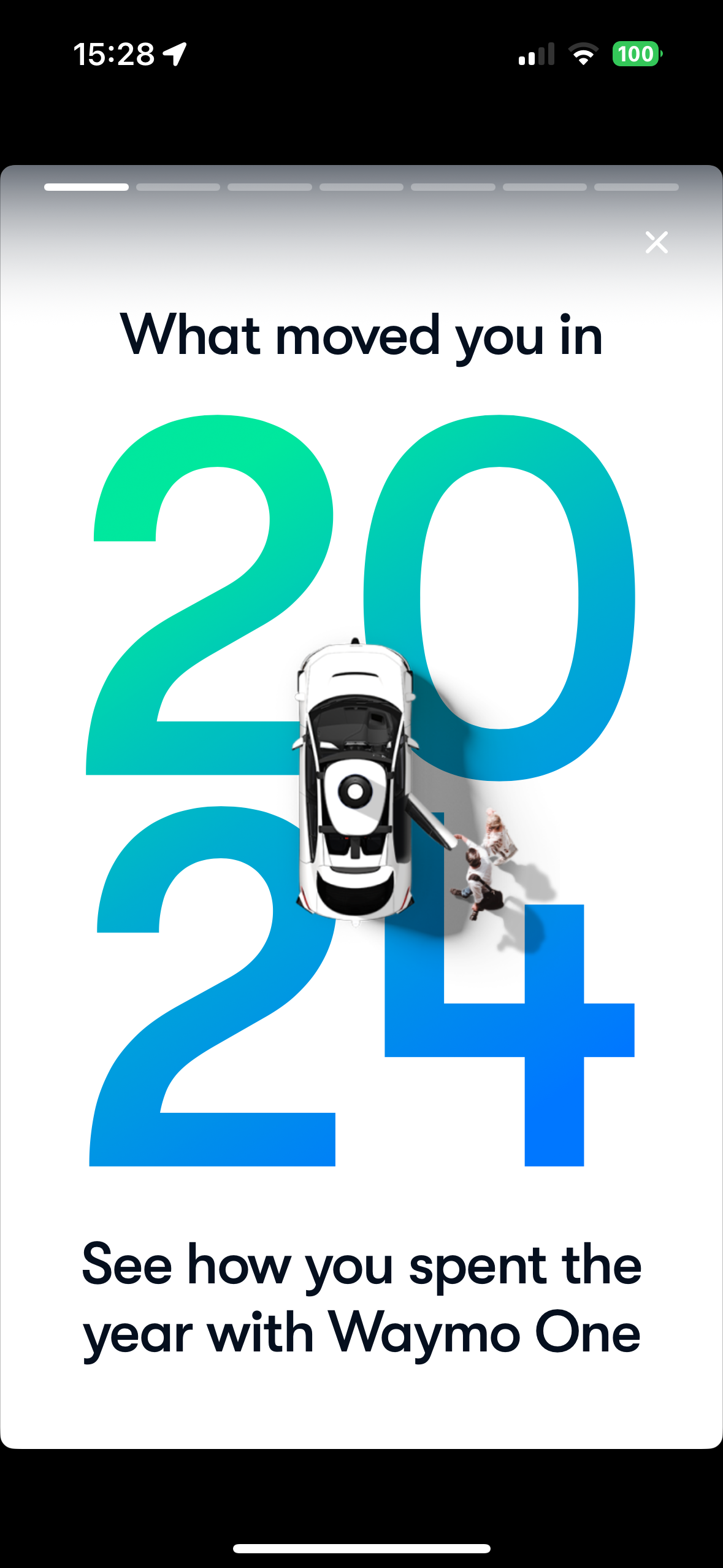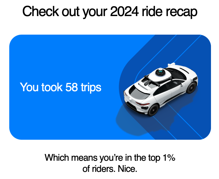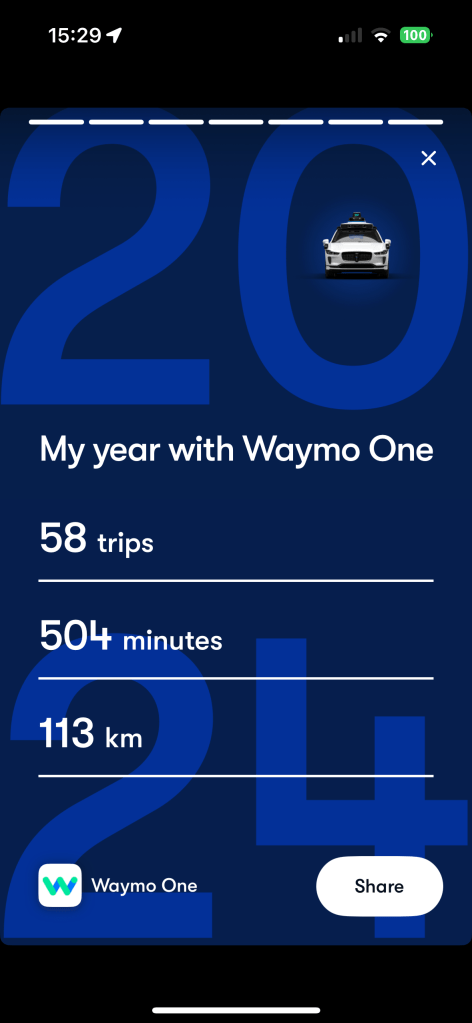 An e-mail arrived in my inbox today and it came from Waymo. Along with a breakdown of my journeys this year. In total, Waymos made more than four million journeys in 2024, and they were completely driverless. They drove over eleven million hours, saving over 6 million kilograms of CO2. In November, Waymo reached its peak number of weekly rides, which has since amounted to 150,000. In total, Waymo serves an area of 500 square miles (1,295 square kilometers) in four metropolitan regions in the USA.