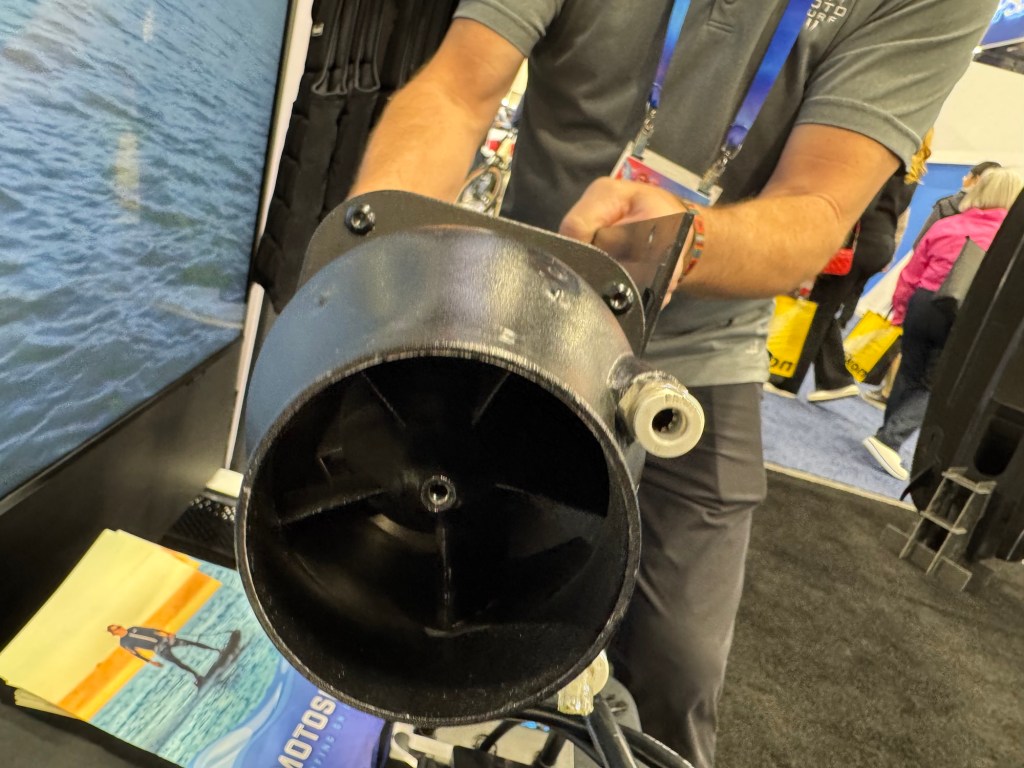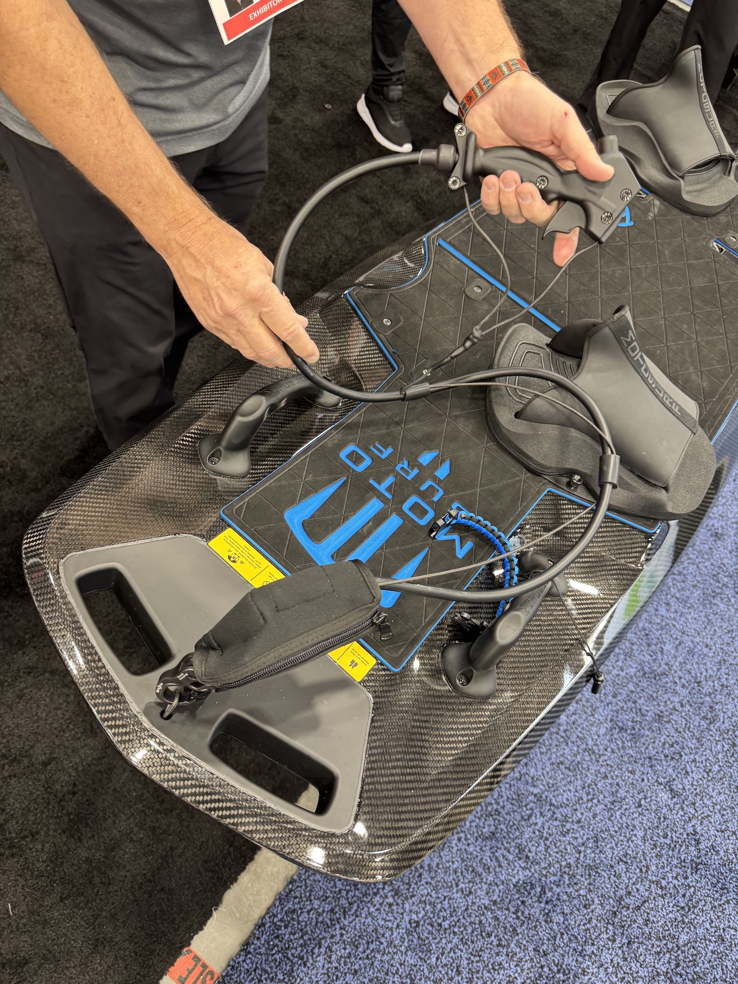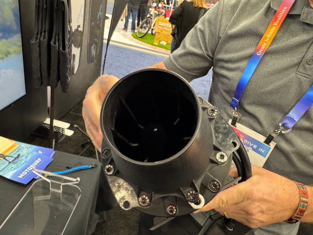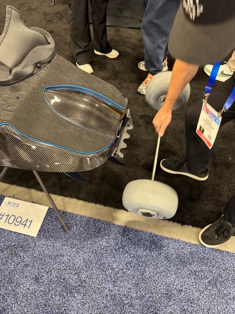 Electric mobility comes in many forms. One new facet is the surfboard, one of which I saw this week at CES 2025 in Las Vegas. The Texas-based company Motosurf builds short surfboards with an electric motor. You can see the battery pack (white) behind the surfboard in the second picture. Wheels can also be attached and detached for easier transportation (last image). The motor is controlled either with a handle connected by cable, or by unscrewing the handles and replacing them with the cable control. The surfboard can then be used on the knees.