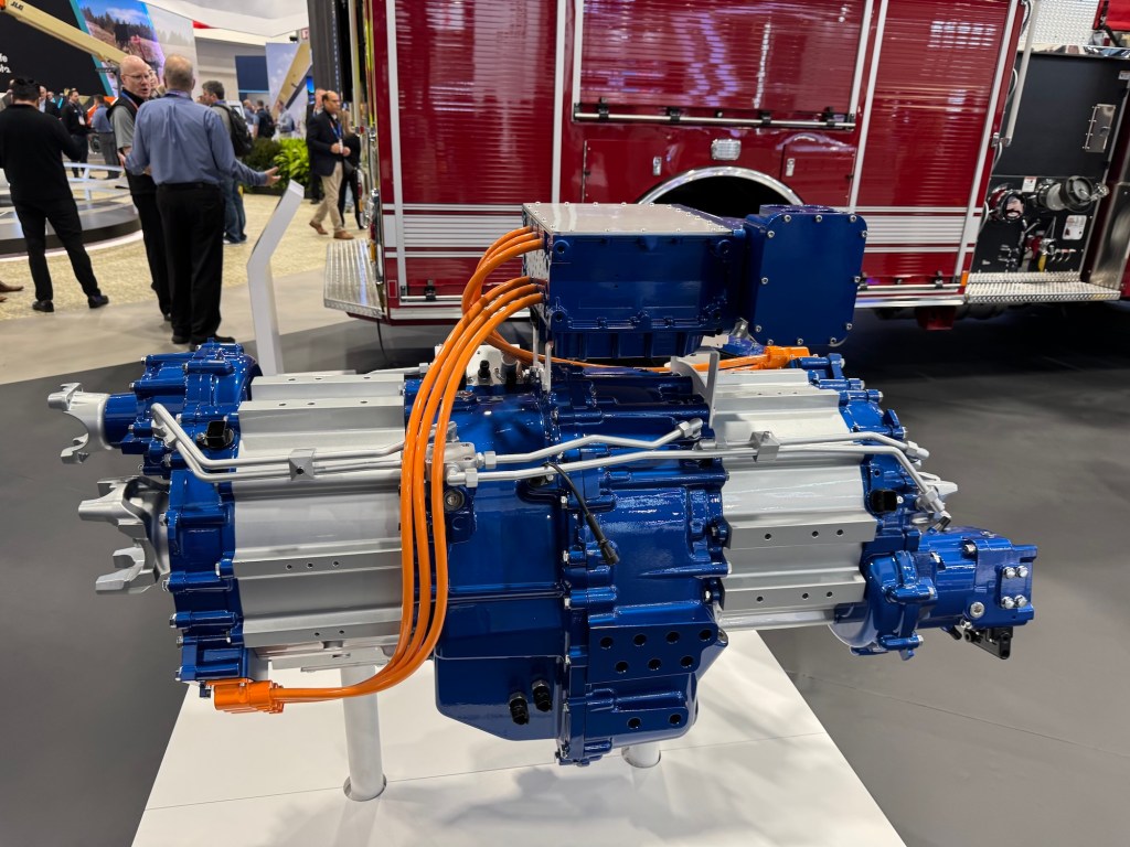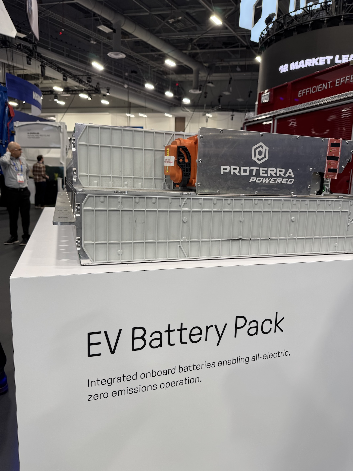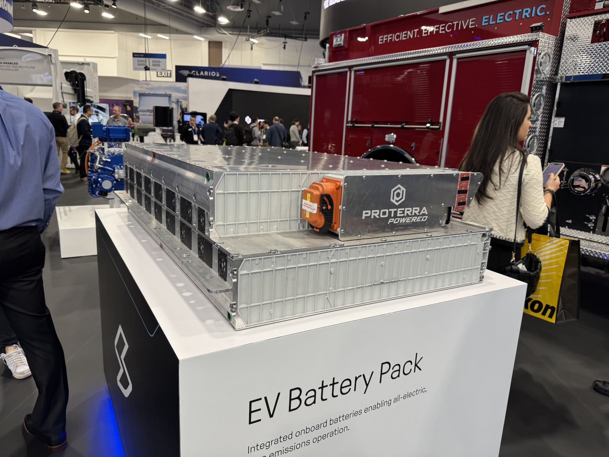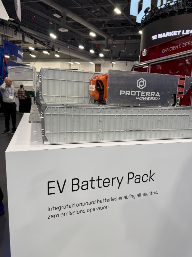 The components required for electrification, such as a gearbox – which is not usually found in electric cars – and the battery packs from Proterra were also on display.