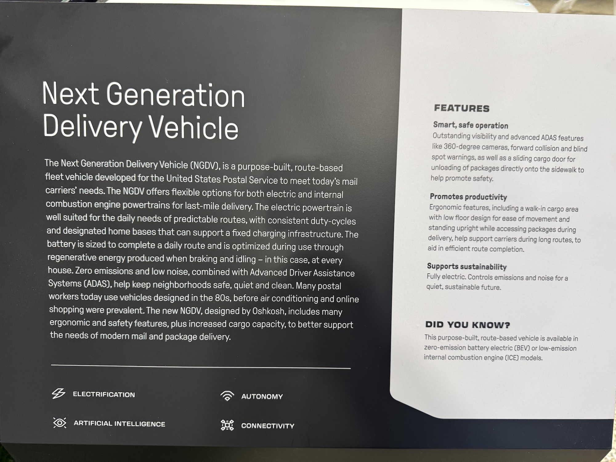 The US Post Office is also converting its hundreds of thousands of small delivery vans from combustion engines to electric drives. Although the now more duck-shaped vehicle no longer looks attractive, no one is likely to think of stealing it and being seen with it – with the exception of the postmen. It should also be noted that the steering wheel is on the right-hand side of the vehicle, because when delivering mail, the driver always stops on the right-hand side of the sidewalk to load the letterbox.