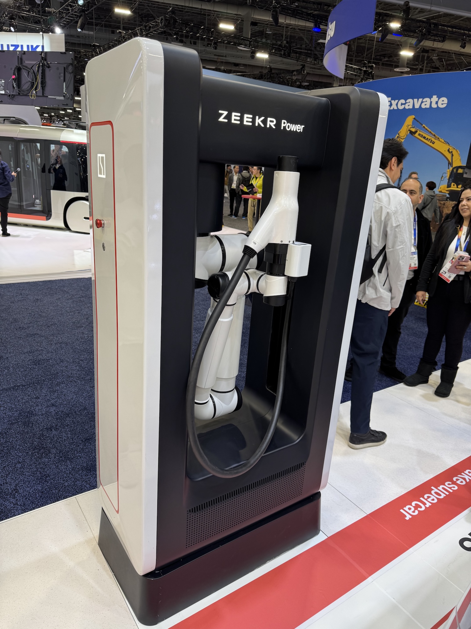 Geely subsidiary Zeekr has almost hidden a charging robot in the middle of its cars. This is stationary and can extend a robotic arm that can flange into the charging socket of an electric car and thus charge the vehicle. Here are a few photos with details: