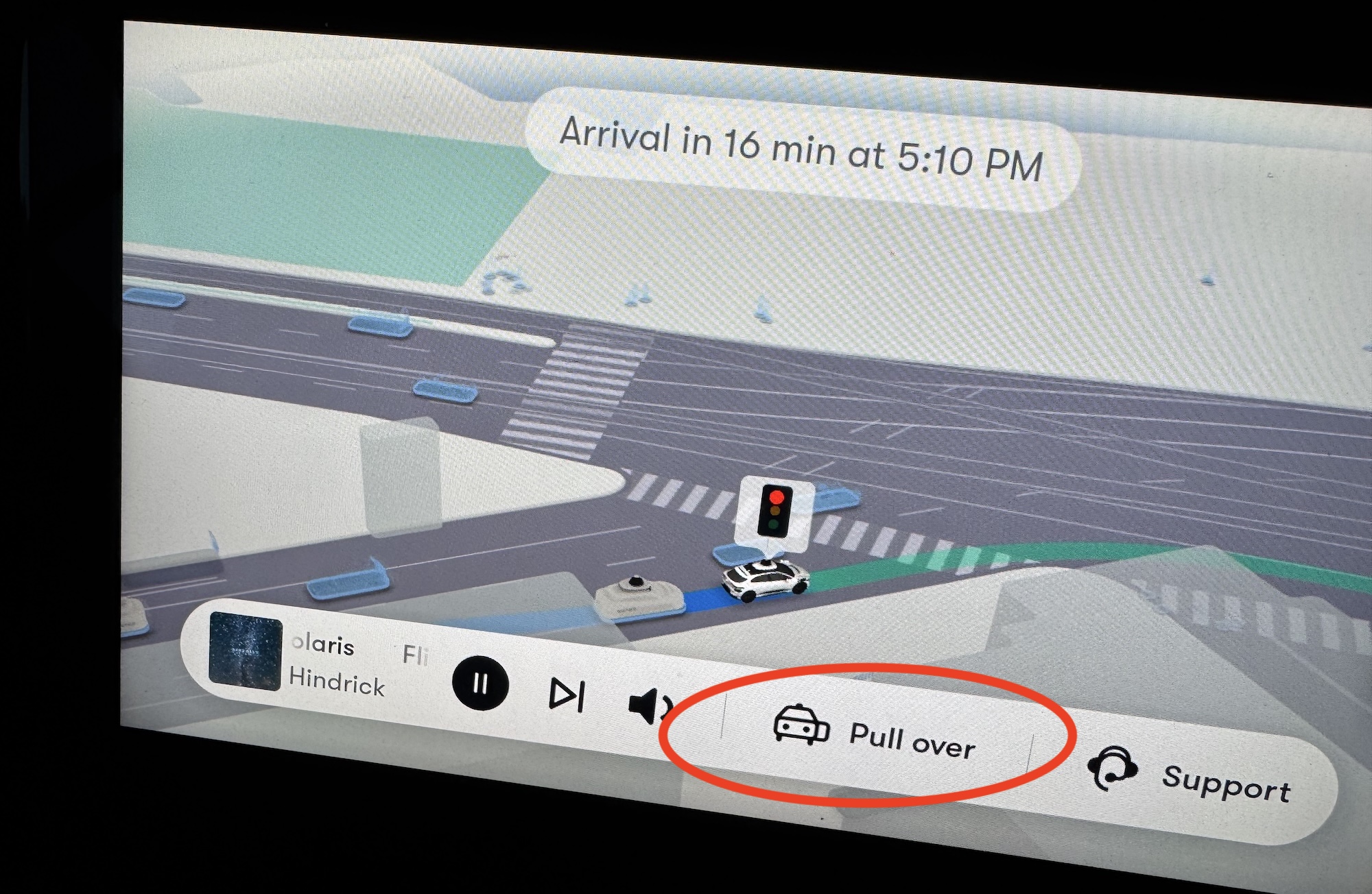 However, passengers have other options to end a journey prematurely, and the function can be found very easily. On both screens – on the front seat and on the rear seat – “Pull Over” is clearly visible. With this function, the Waymo drives safely to the side of the road, stops and lets the passenger get out. The journey is over and the passengers have got out.