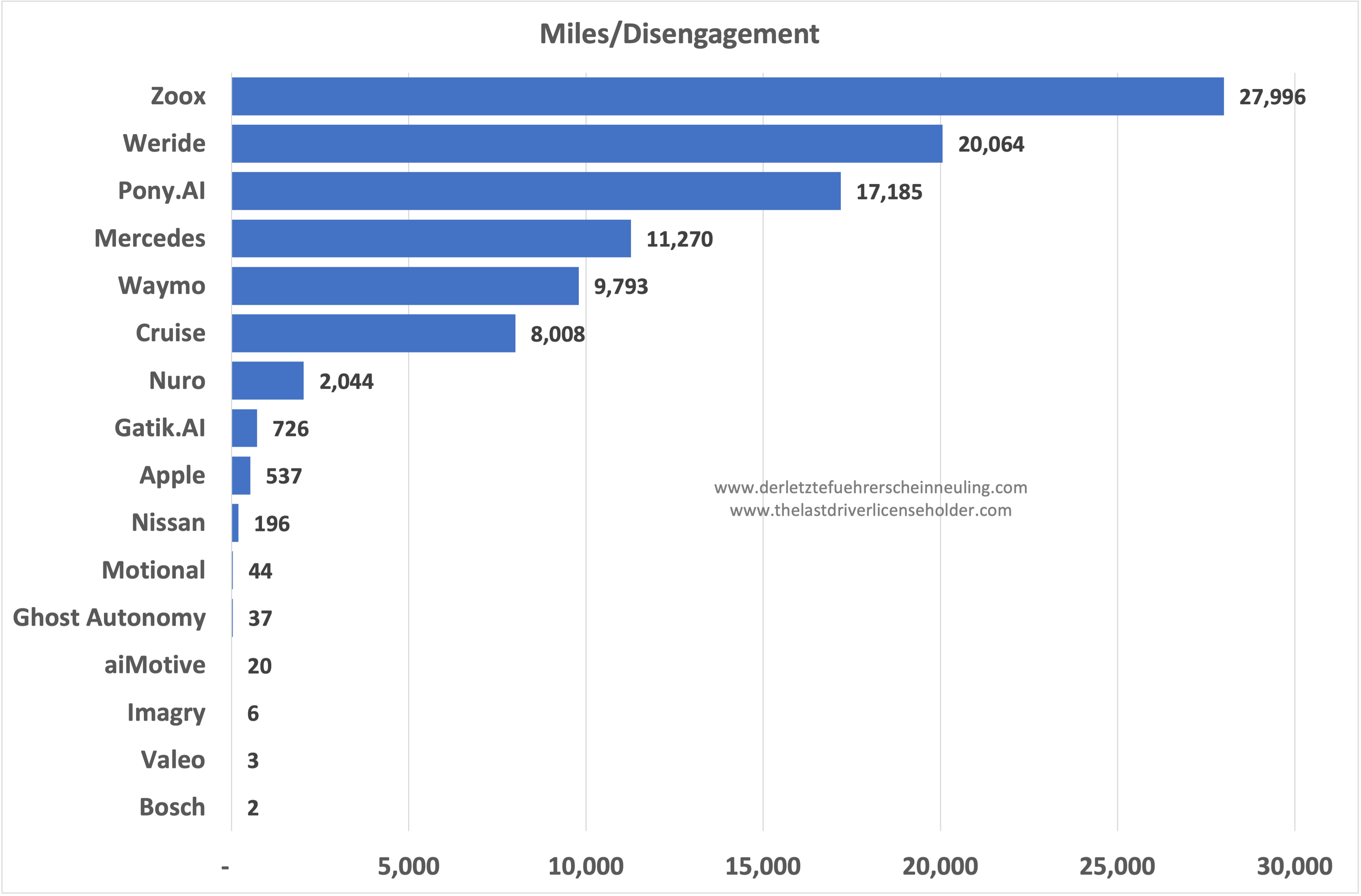 As always, the present evaluation of how many kilometers a vehicle drives autonomously before a safety driver has to intervene should be treated with caution, as the way in which a disengagement is determined is left to the companies.
