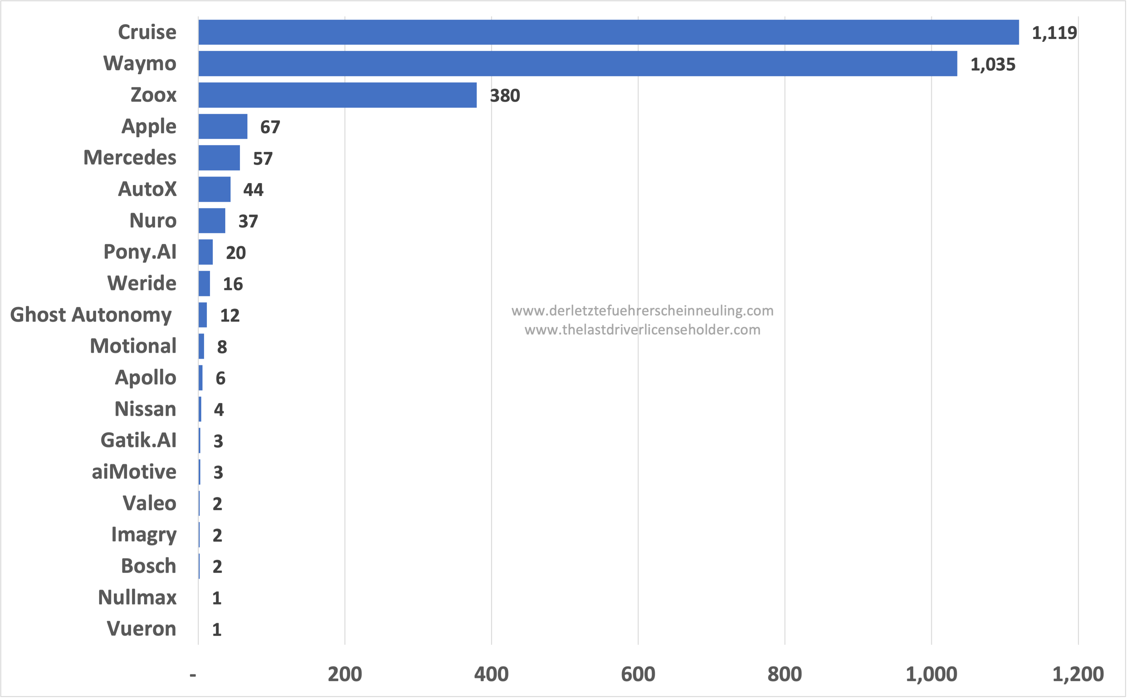A total of 20 companies have reported data for the entire year (December 1, 2023 to November 30, 2024). Furthermore, 6 manufacturers (Apollo, AutoX, Nuro, Waymo, WeRide, Zoox) are still licensed to operate the vehicles without safety drivers, as in the same period last year, and three are allowed to operate them commercially (Mercedes-Benz, Nuro, Waymo).