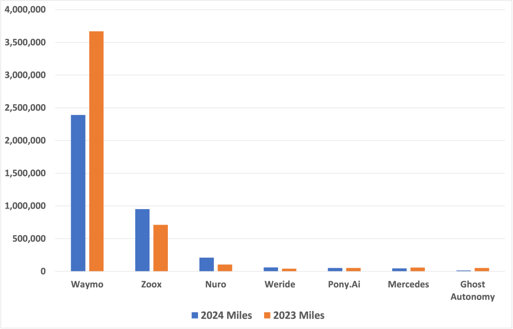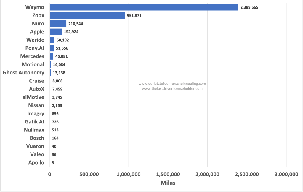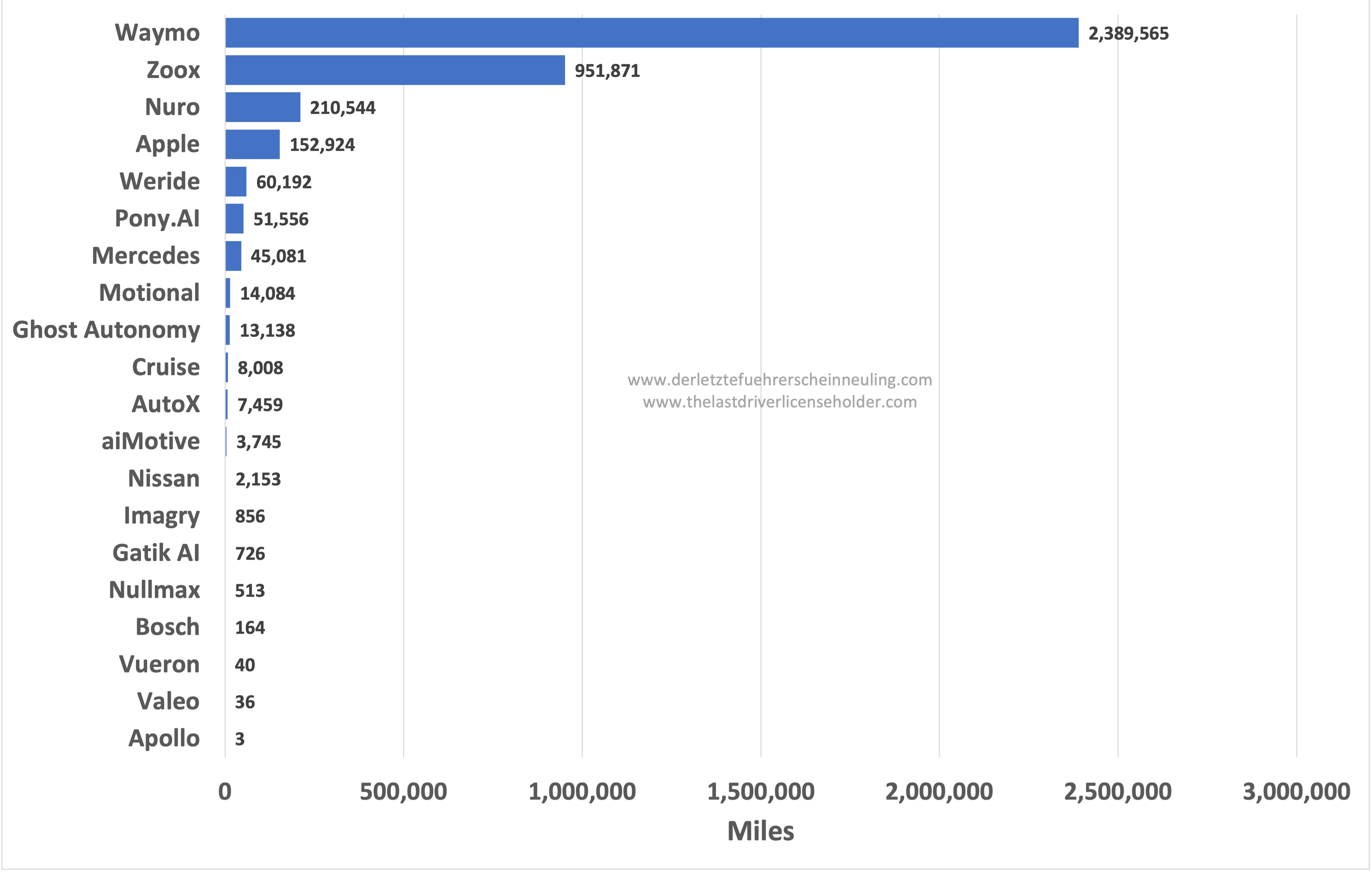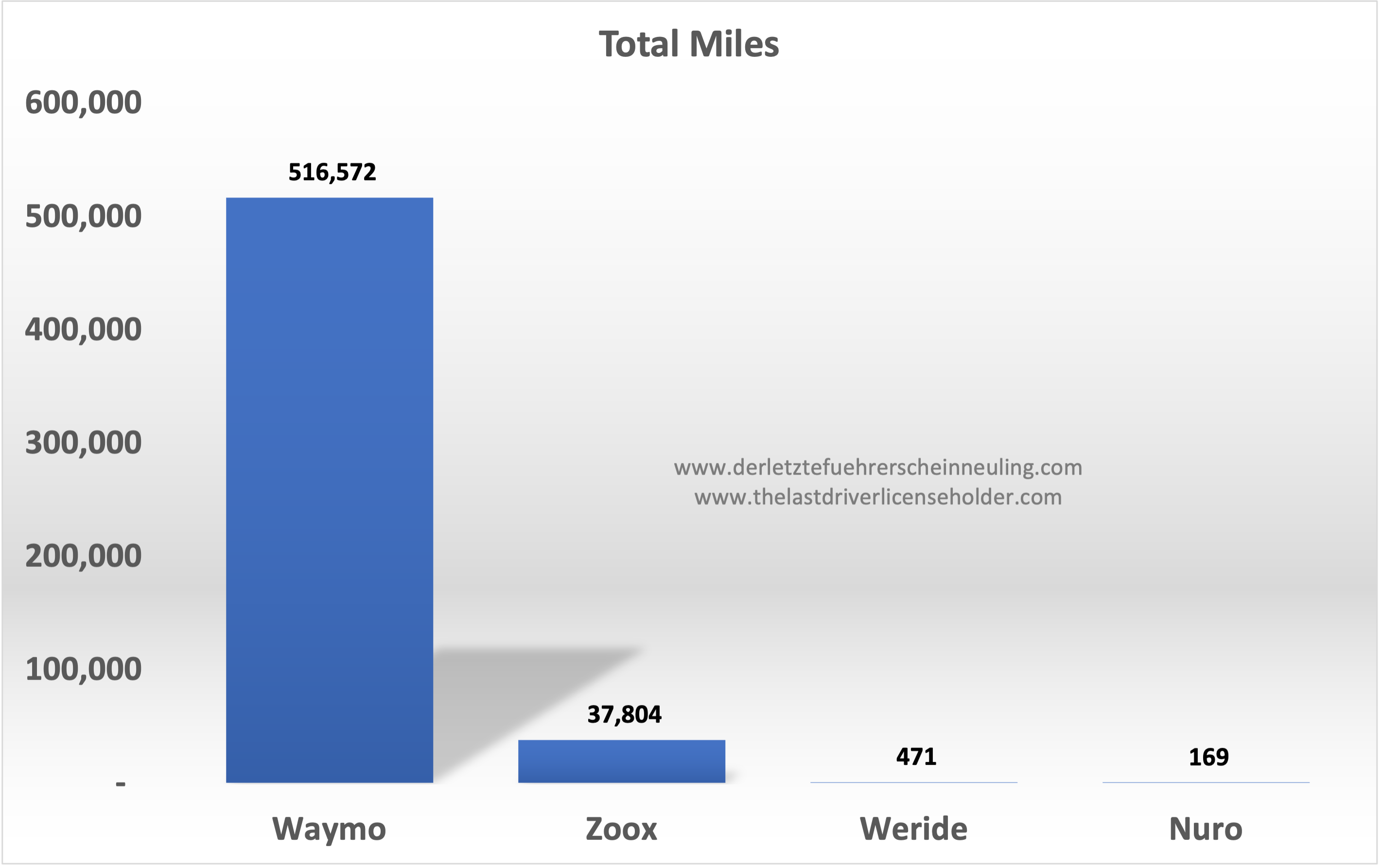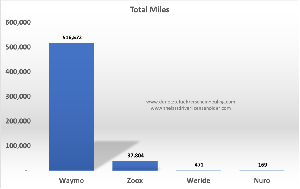 Six companies (Apollo, AutoX, Nuro, Waymo, WeRide and Zoox) have a driverless license and reported figures on this. In total, four of the companies (Nuro, Waymo, WeRide and Zoox) completed 888,027 driverless kilometers (555,017 miles) in the comparison period.