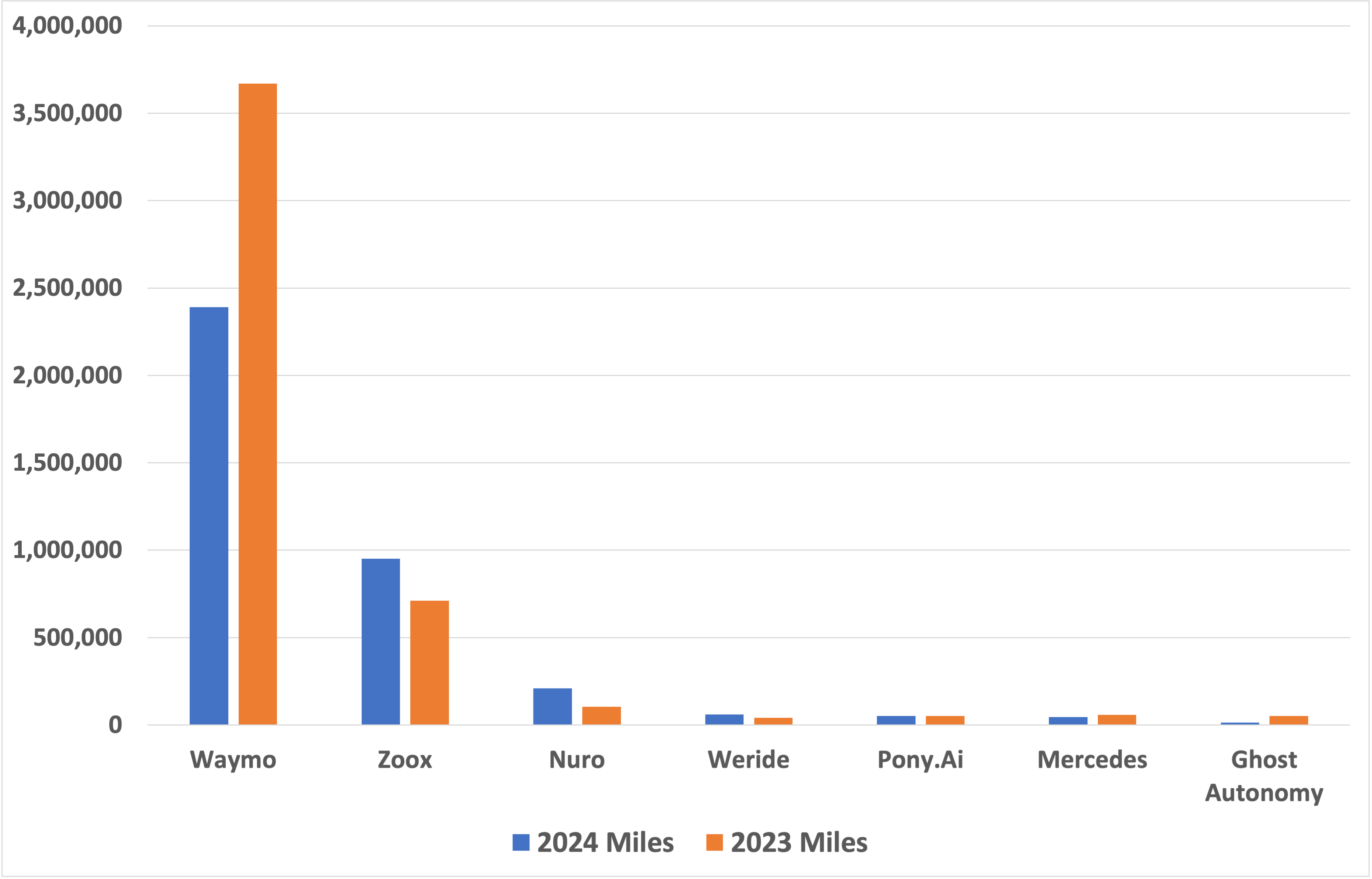 First of all, there are the reports on driving with safety drivers in the vehicle. A total of 2,819 autonomous vehicles were in operation in California during the period, an increase of 76 percent on last year’s 1,603. Cruise had the most with 1,119 vehicles (510 vehicles in 2023, which have not been in operation since October 2024 due to the discontinuation of Cruise by GM). Waymo had 1,034 vehicles, an increase of 136 percent on 438 vehicles in 2023, while Zoox had 380, an increase of 34 percent.