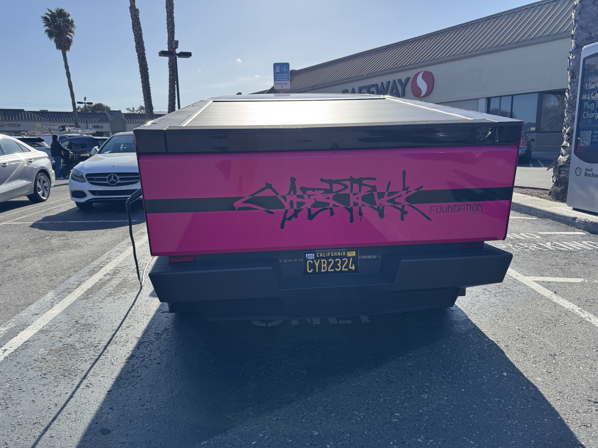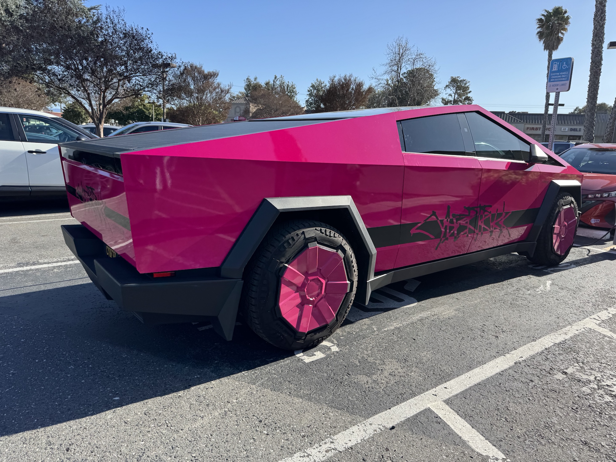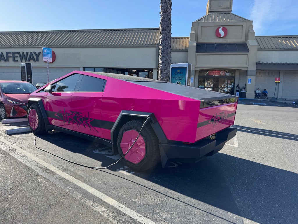 I came across the pinkest Cybertruck today in Sunnyvale on South Bernardo Ave in front of the Safeway supermarket. Pinker than it possible ever can be, it was standing there sucking on the slow charger.