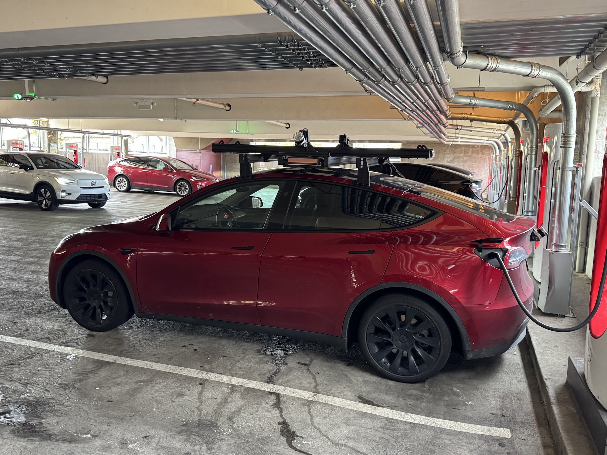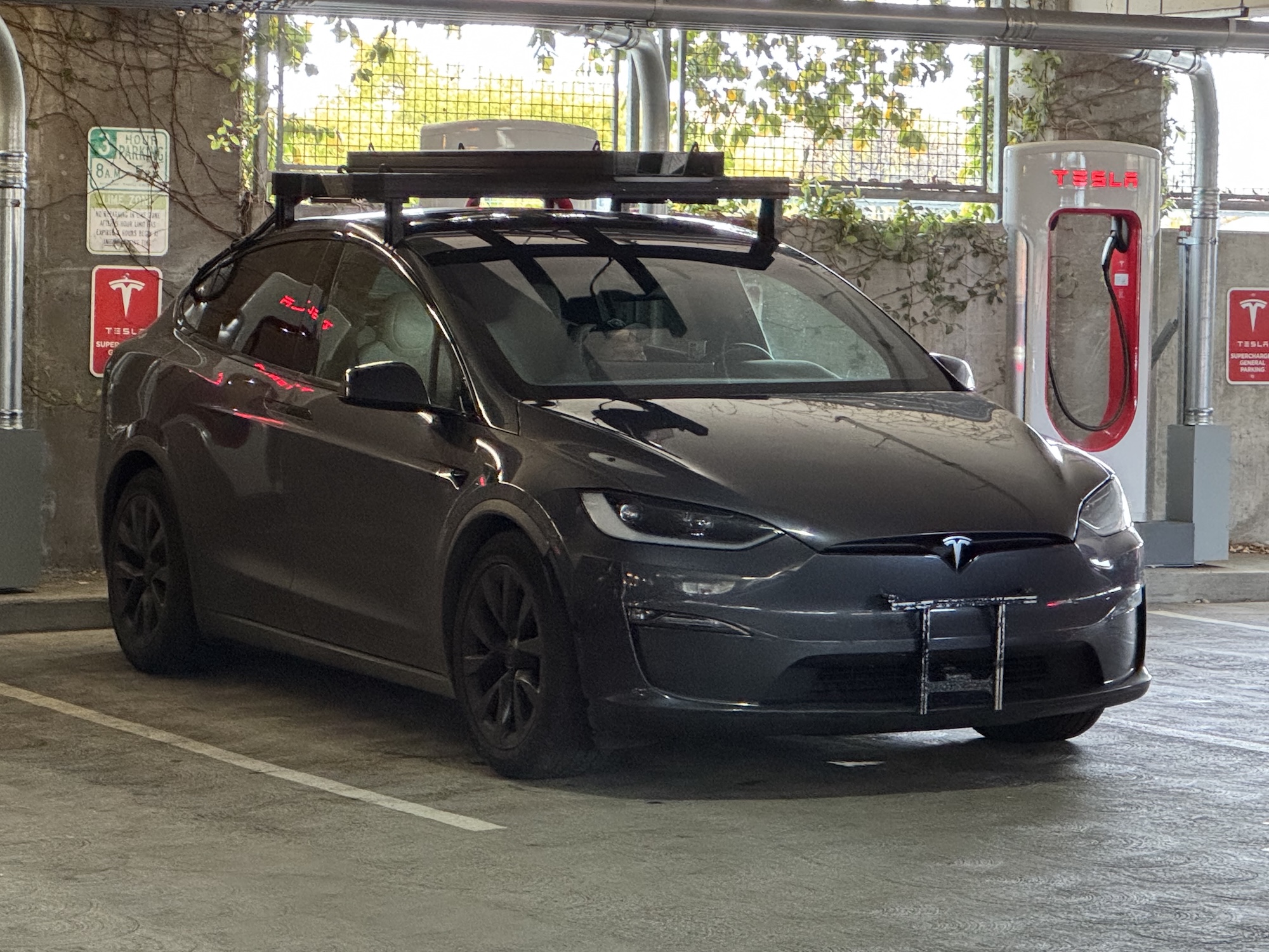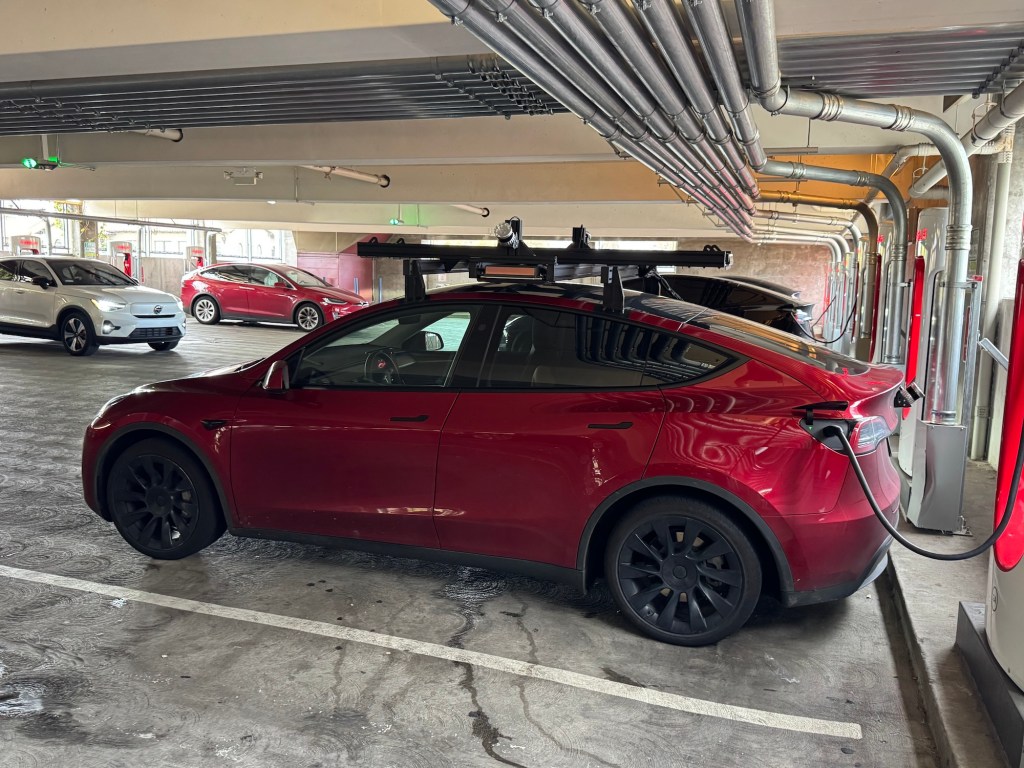 Once again, a Model Y and X with lidar racks have been spotted, this time in the Bryant Street Garage at the Superchargers. What is remarkable this time is the lidars pointing diagonally downwards. This arrangement also appears to be used for so-called “ground truth tests”, for example to calibrate cameras with system data.
