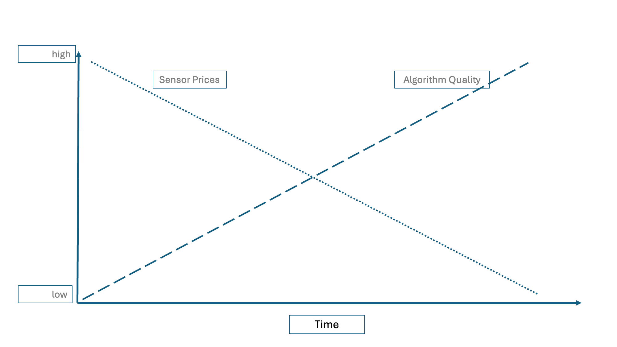 Who can capture more market share depends above all on who wins the race to answer the following question: Will a Waymo sensor stack become cheaper more quickly and therefore ready for use in many vehicles, or will the algorithms in the Tesla approach become better and safer more quickly?