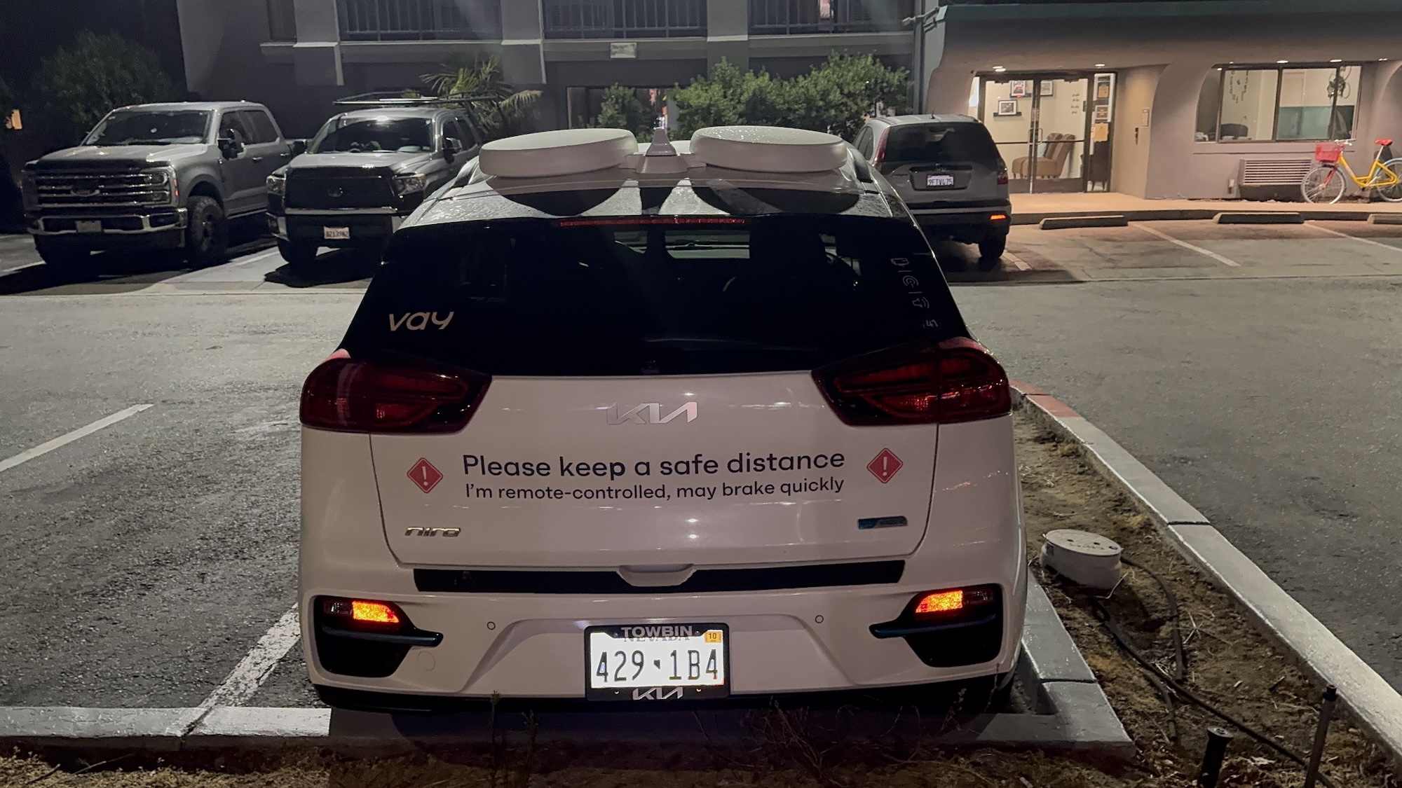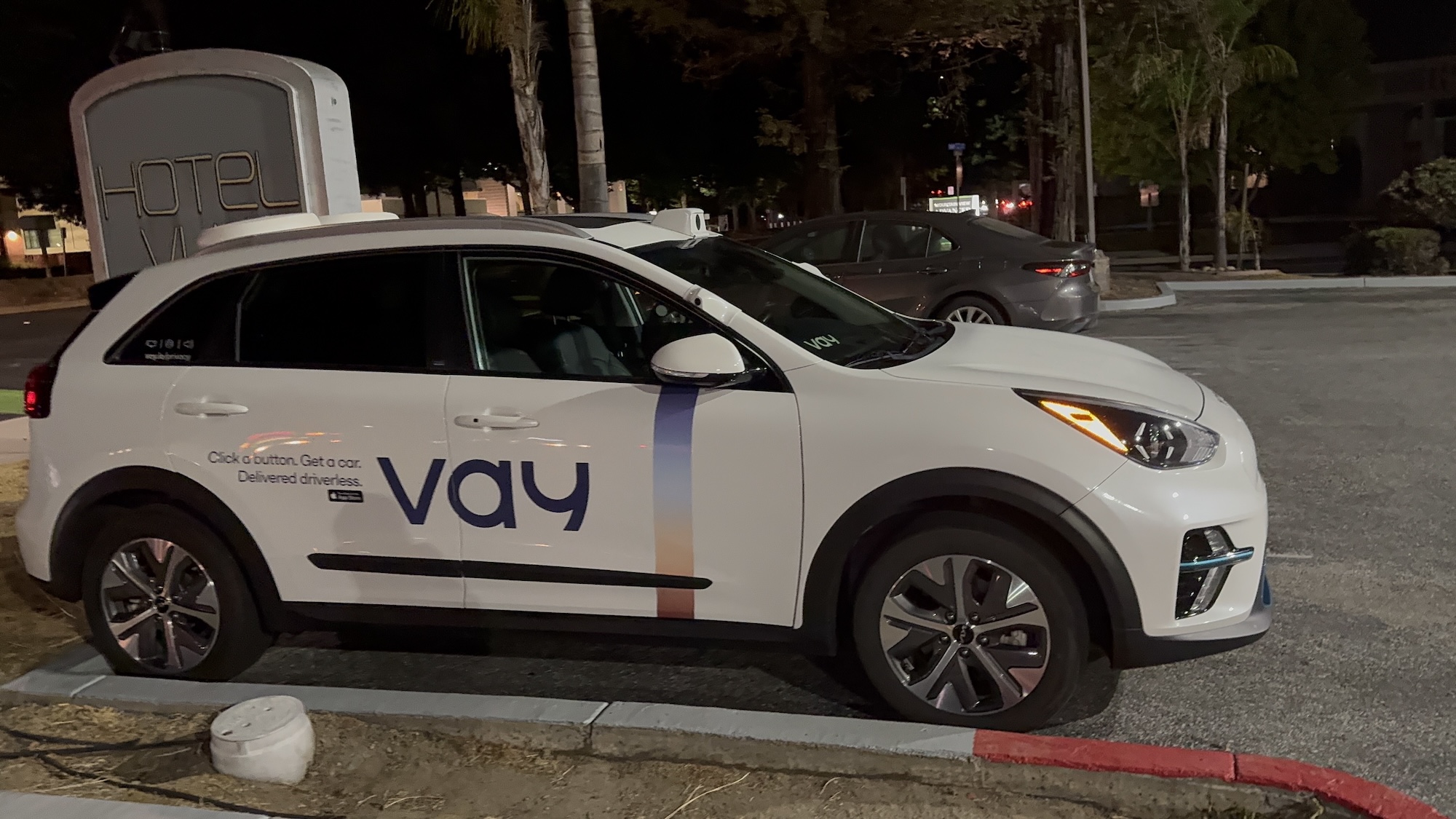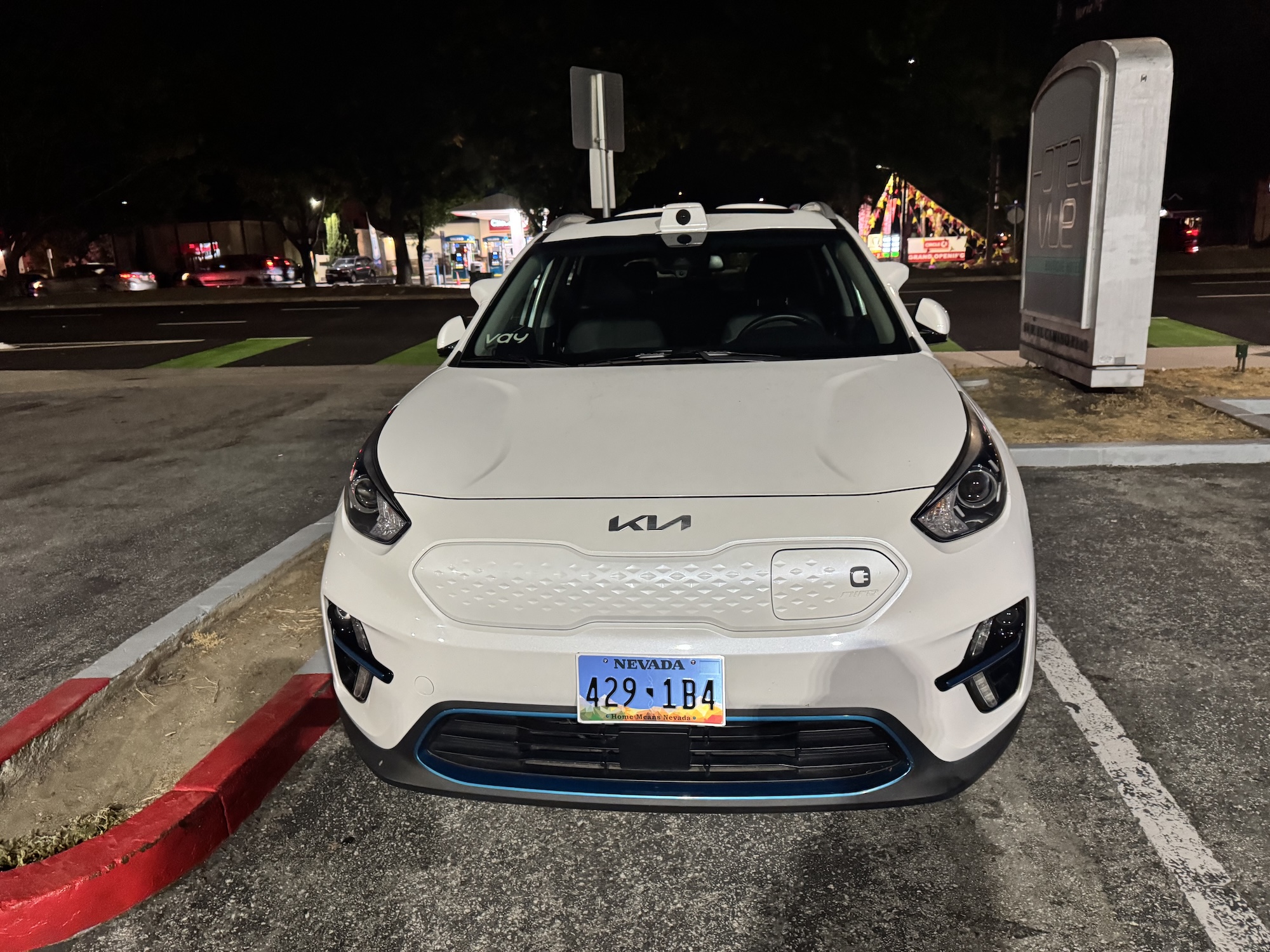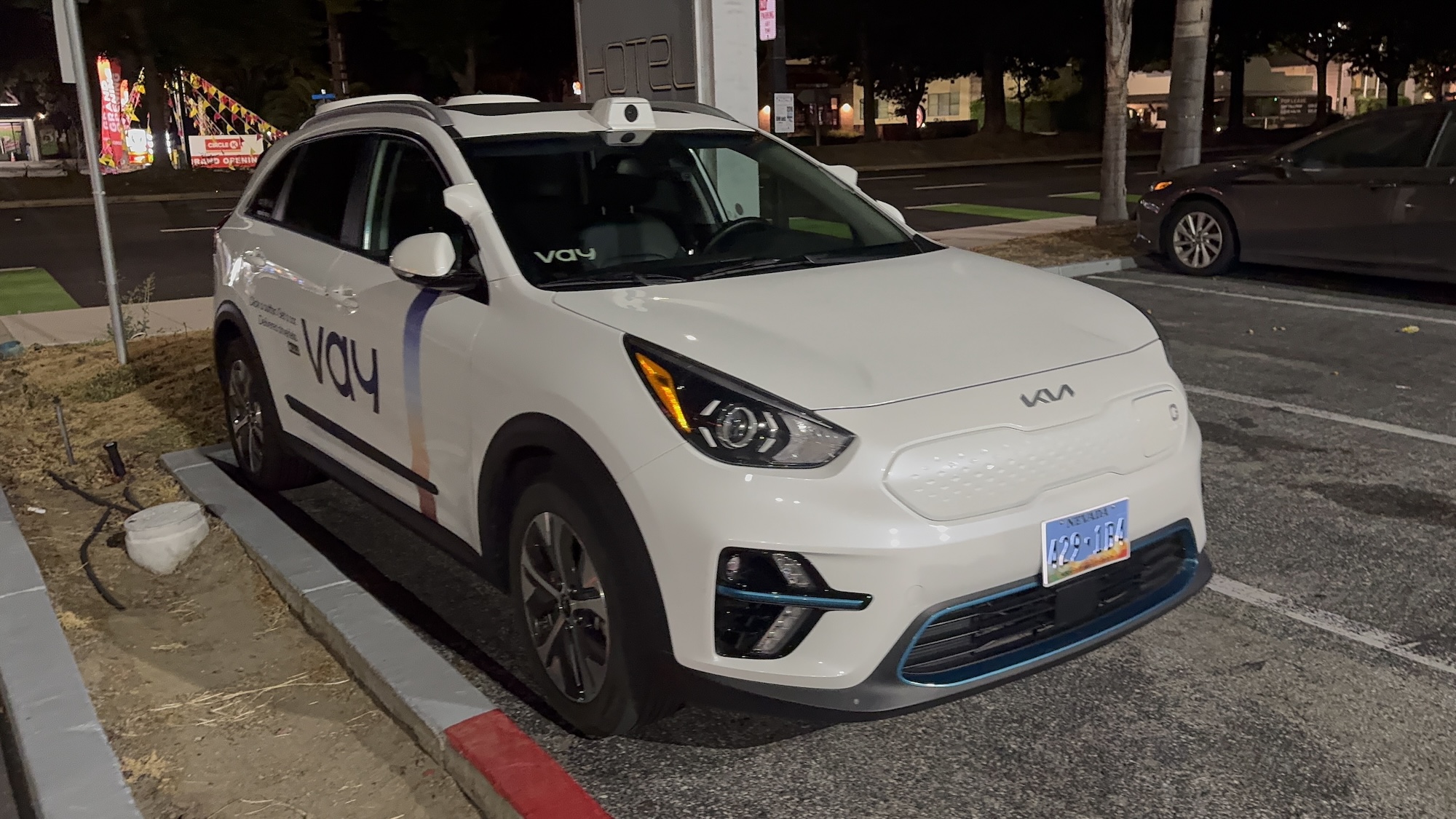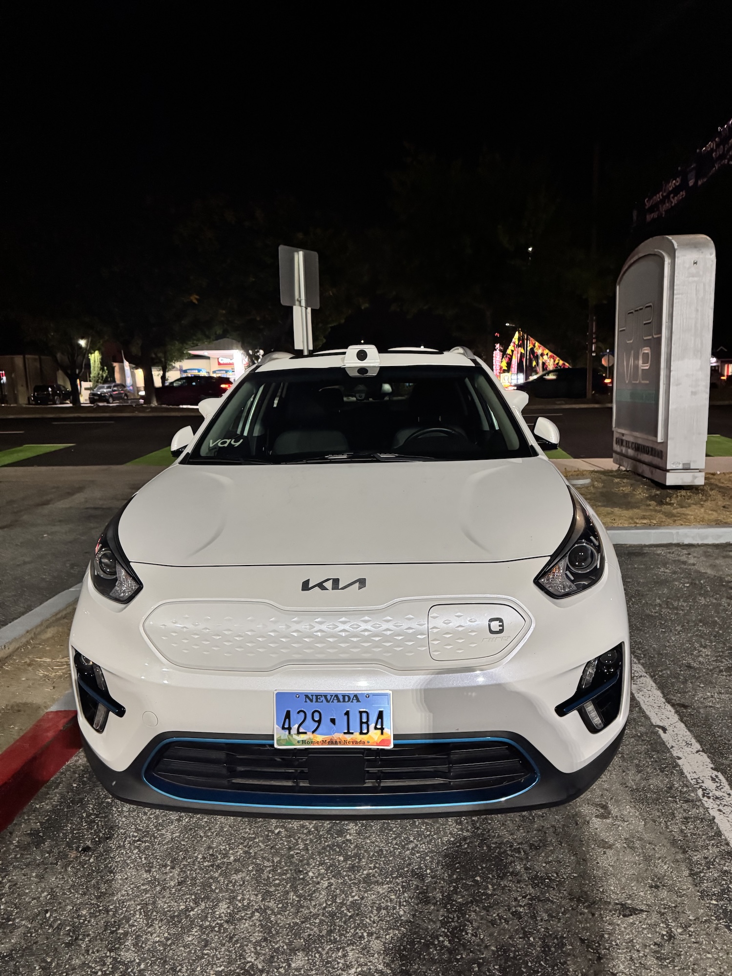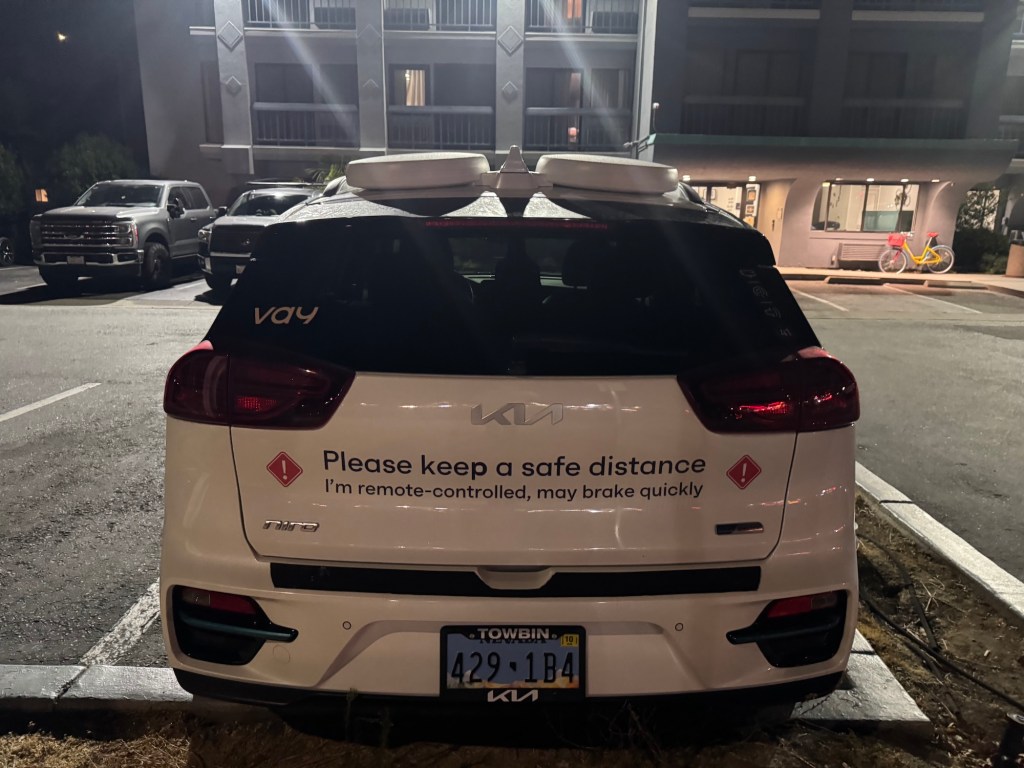 This Vay vehicle was spotted on August 11, 2025, at around 10:10 p.m. PDT in Mountain View in front of the Hotel Vue. Vay manufactures technology for remote-controlled vehicles. In this case, the base vehicle is a Kia with a Nevada license plate.
