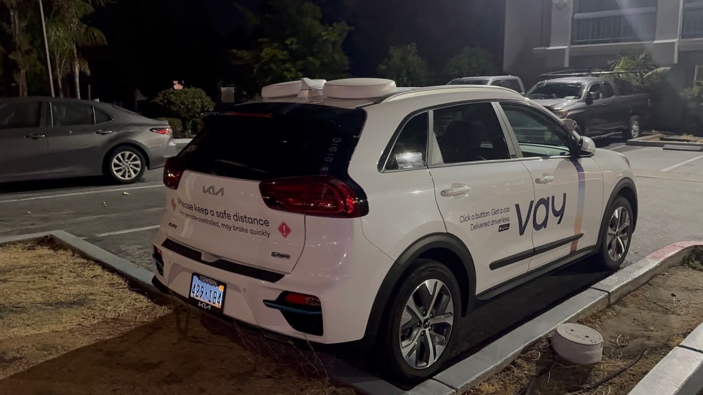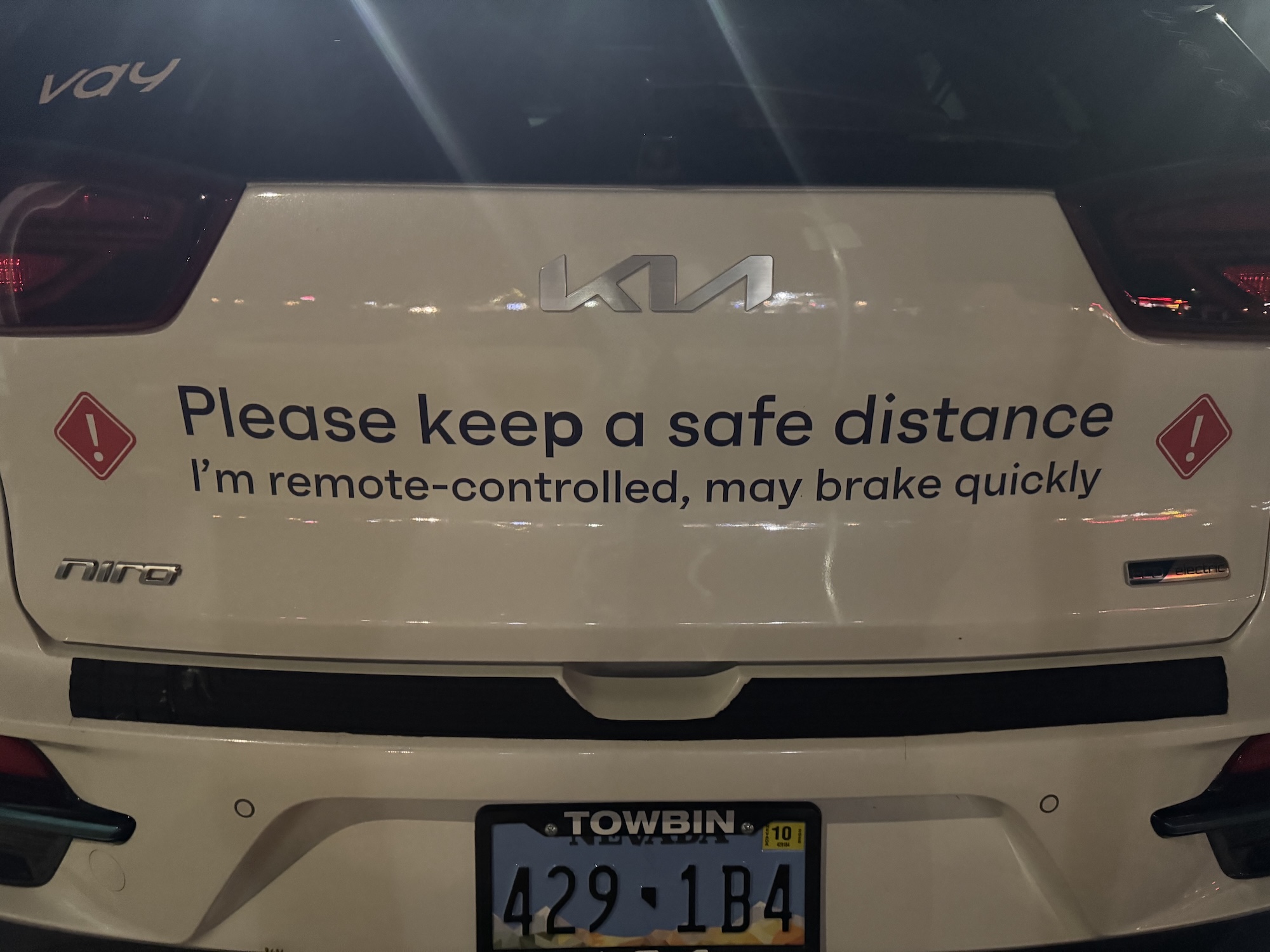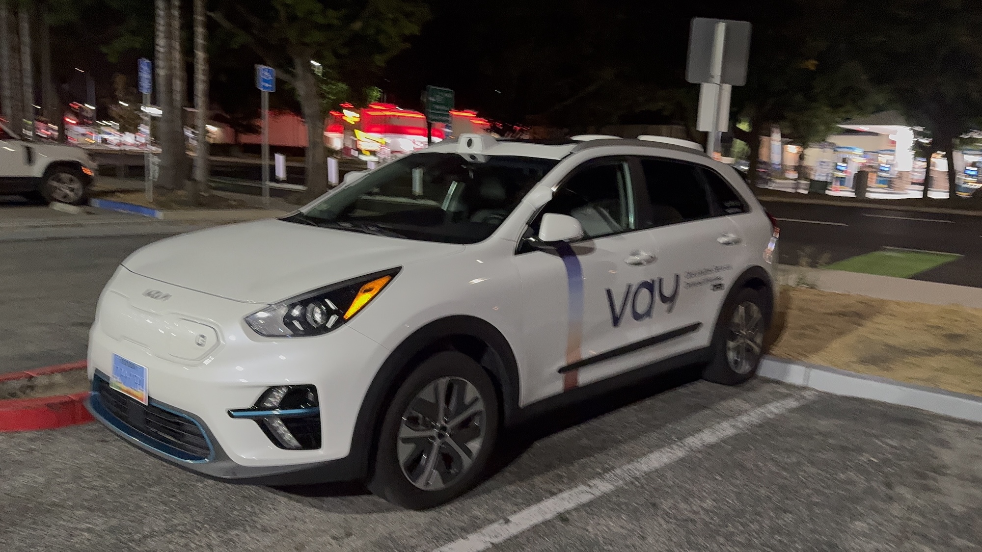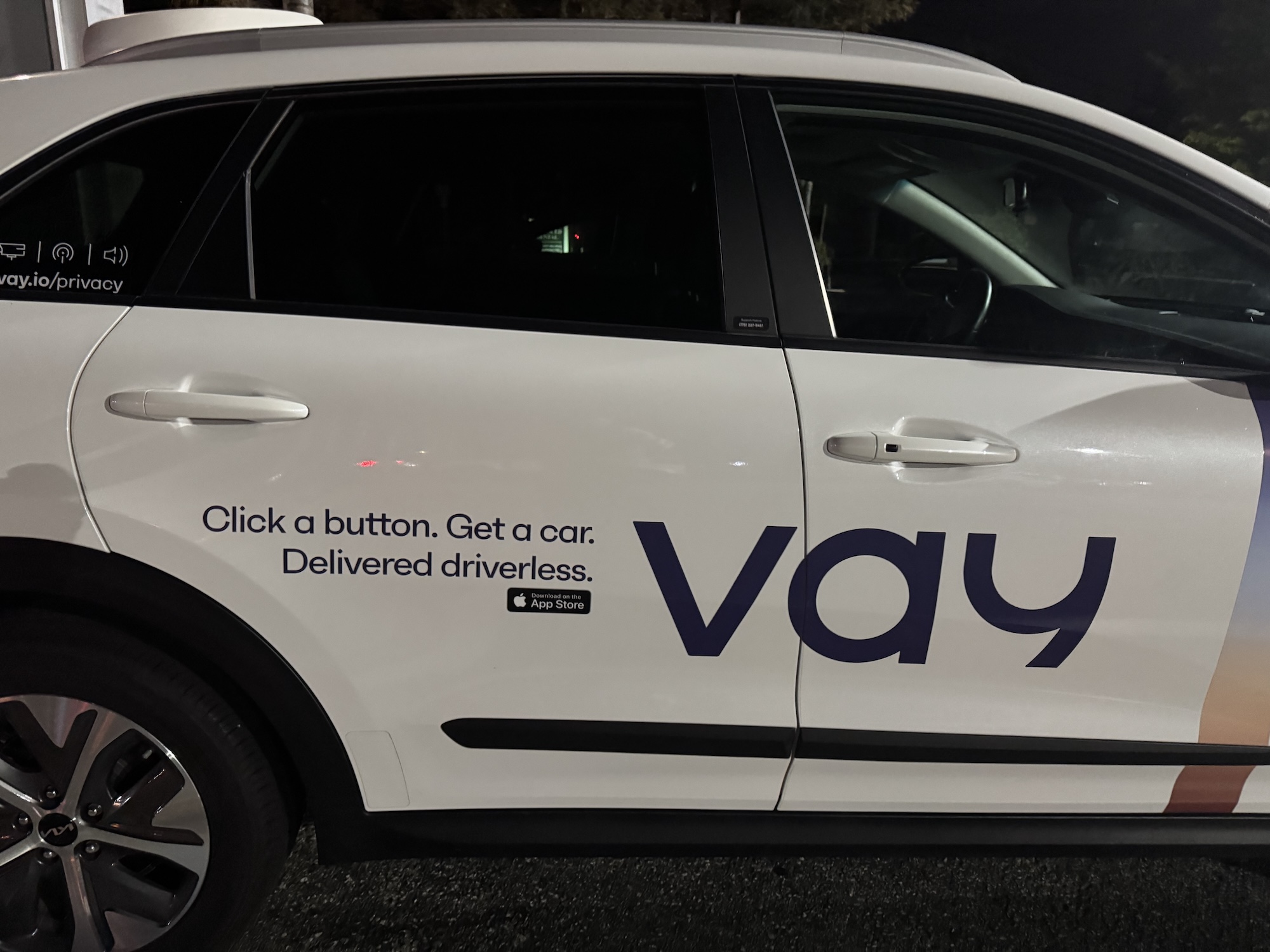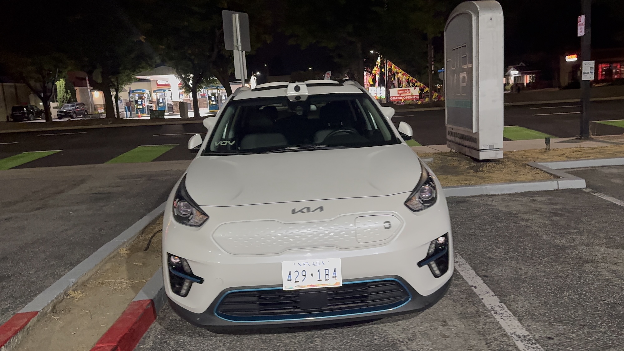 This Vay vehicle was spotted on August 11, 2025, at around 10:10 p.m. PDT in Mountain View in front of the Hotel Vue. Vay manufactures technology for remote-controlled vehicles. In this case, the base vehicle is a Kia with a Nevada license plate.