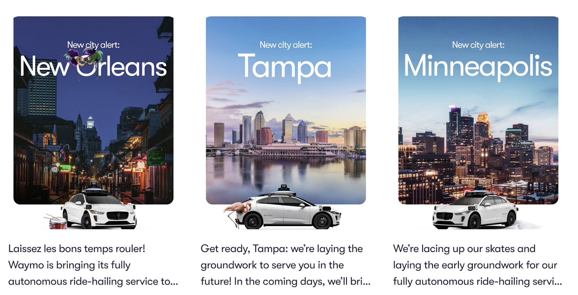There’s no time to catch your breath. Waymo has barely announced that it will start operations in San Antonio, Miami, Houston, Orlando, and Dallas, and already Waymo is stepping up its game. New Orleans, Tampa, and Minneapolis are now the next regions for the robot taxi service.