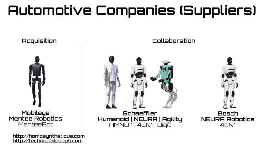 Some Tier 1 suppliers in the automotive industry are also collaborating with humanoid robot manufacturers on development, or have even acquired a robot manufacturer (see Mobileye, which recently acquired Mentee Robotics).