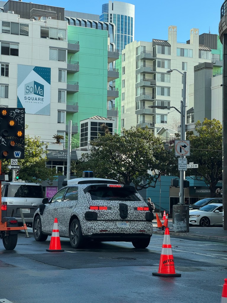 This camouflaged Hyundai Ioniq 5 with Waymo Driver 6th generation superstructure was spotted by an anonymous reader today at 9:22 a.m. on 3rd Street and Folsom Street.