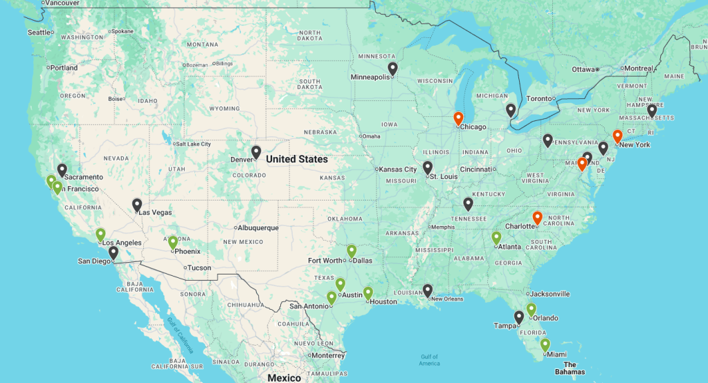 The global map showing all of Waymo’s robot taxi activities can be found here: